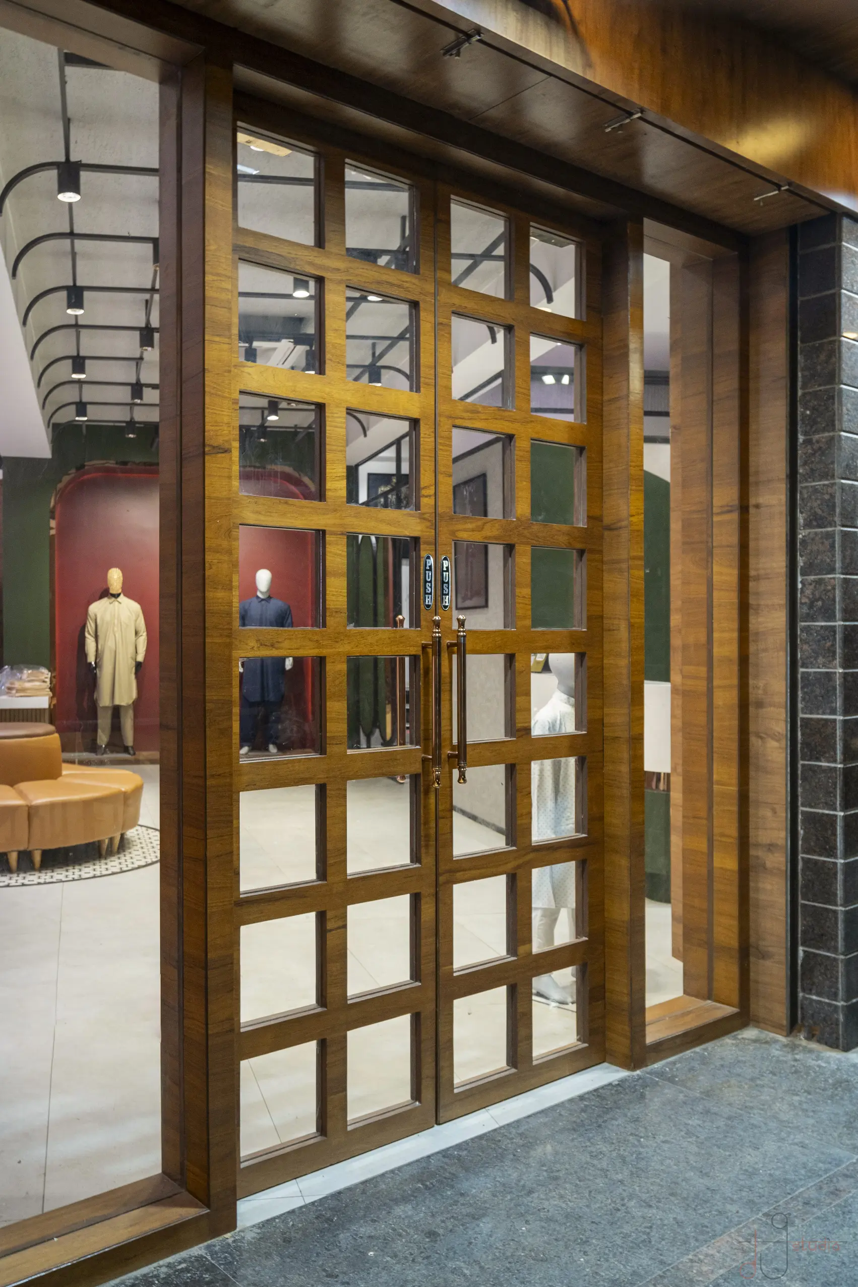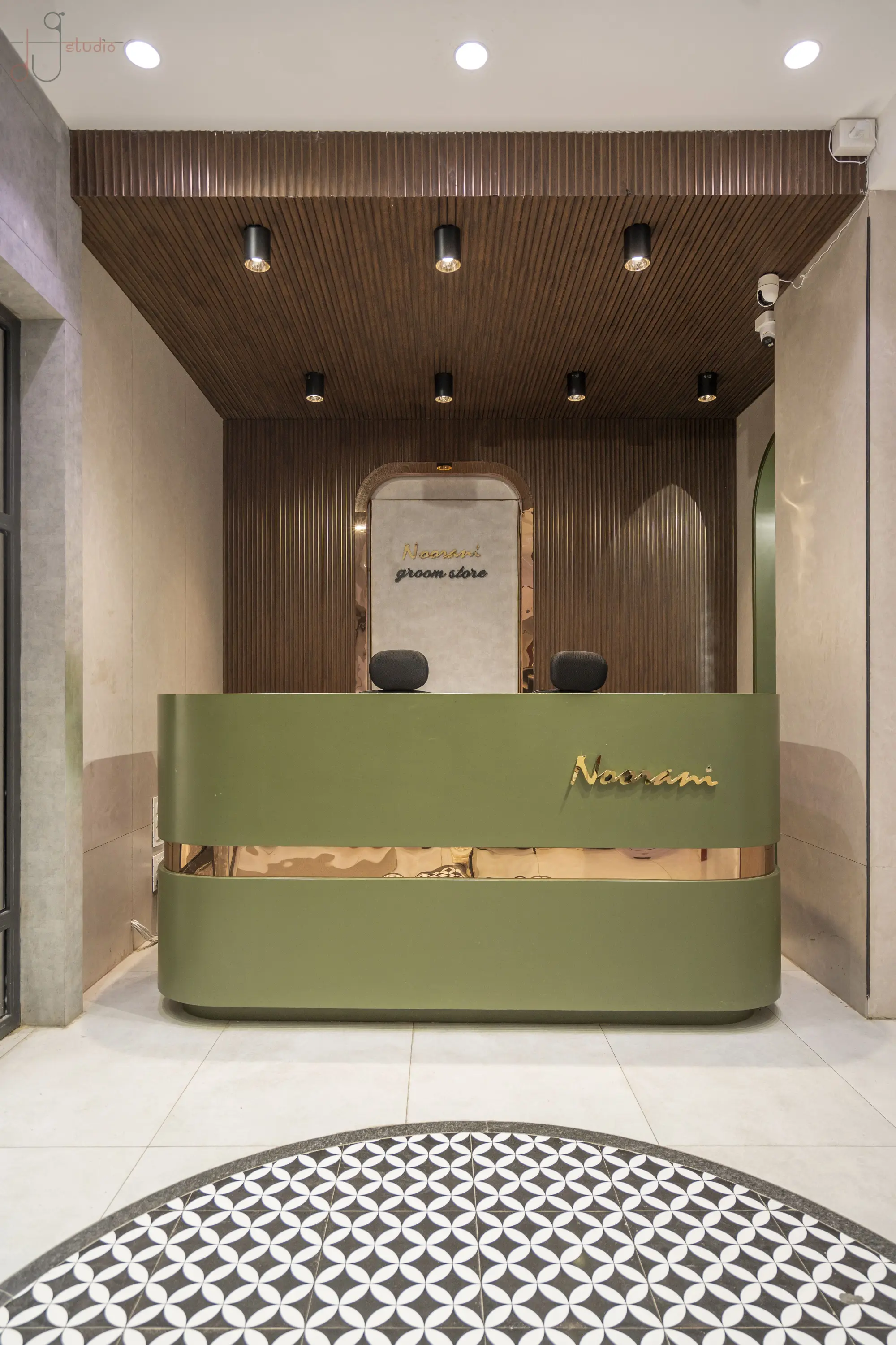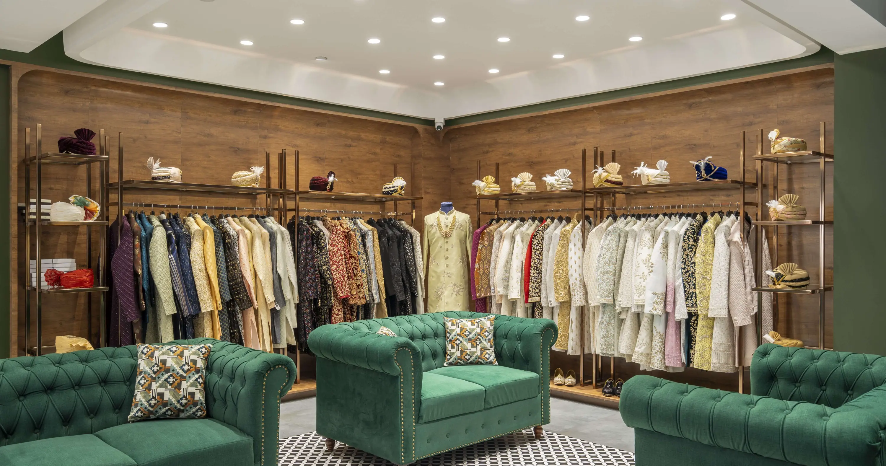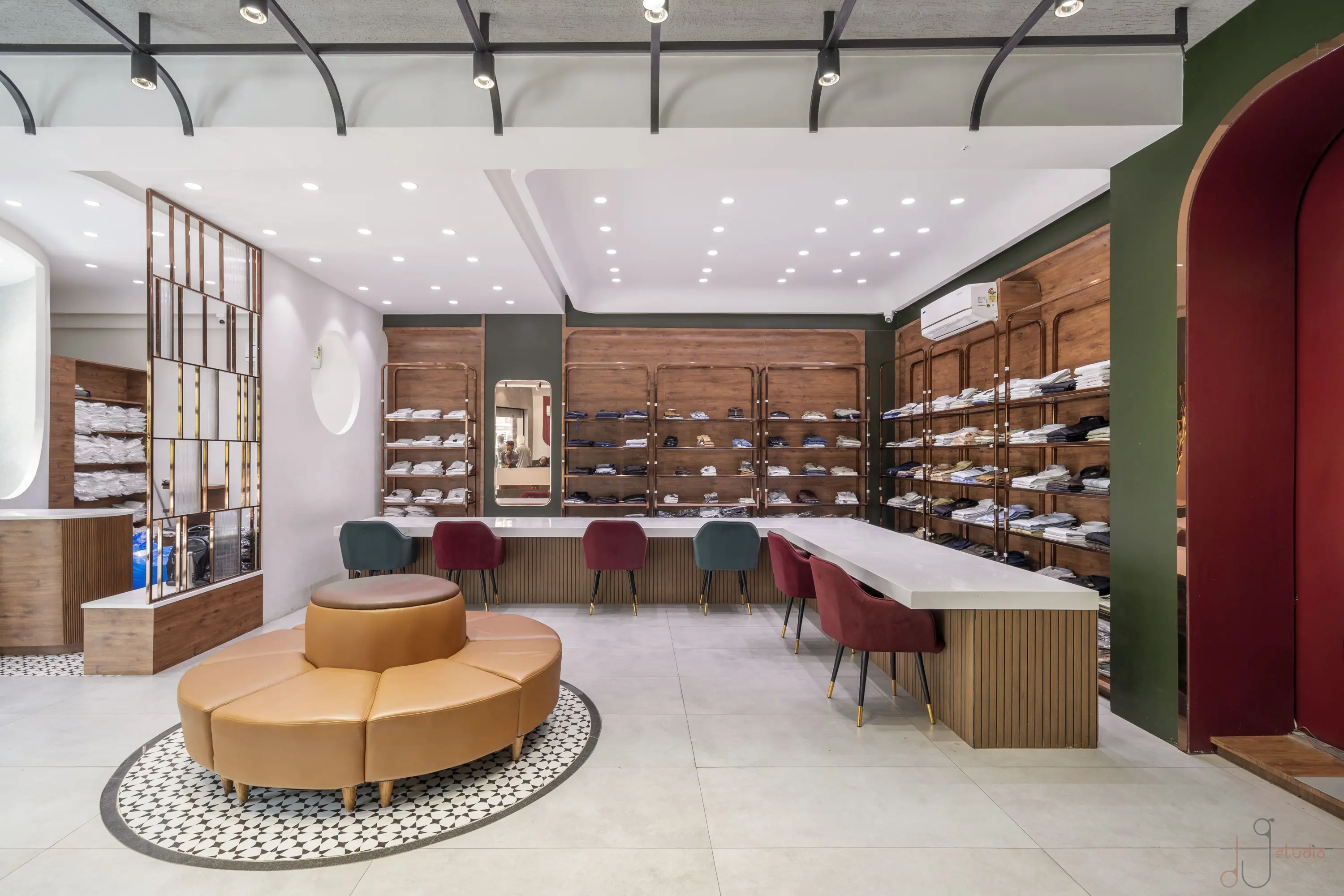 The Noorani Groom Studio is spread across an expansive 6000 sq.ft, meticulously distributed over three levels — each floor catering to a specific category of the groom’s ensemble. The Ground Floor serves as the ready-to-wear Kurta-Pyjama zone. The First Floor showcases an exclusive range of Traditional Sherwanis and Formal Groom Attire. The Second Floor continues the brand legacy by offering dress materials, tying the past to the present. Initially designed as disconnected floor plates, the biggest challenge was to connect the three levels seamlessly. A carefully planned internal staircase was introduced — not just as a circulation solution, but also as a strategic design element. It was positioned in such a way that it integrates naturally into the layout, maintaining the visual balance of each space without disrupting the merchandising flow. Design Brief & Response: The client, already a known name in the dress material business, envisioned scaling up into an exclusive luxury groom studio. The interiors had to reflect this shift — not just visually, but emotionally. It wasn’t just about aesthetics; it was about creating an aspirational retail destination. There was a double responsibility on us — to deliver a space that:There was a double responsibility on us — to deliver a space that: 1.Attracts high-ticket clientele, and 2.Elevates the brand perception into the premium segment. Thus, every design decision — from material palette to lighting, spatial planning to detailing — was approached with deliberate intent. Design Language: A rich yet balanced palette of terracotta red, deep green, wood, and gold invokes both regal sophistication and cultural familiarity. Elements like arched mirrors, metal frames, and vintage lighting celebrate traditional craftsmanship with a modern retail edge. A central display niche with bold signage becomes a storytelling focal point, while the plush emerald green sofa adds comfort and a touch of boutique luxury. Track lighting is used effectively to highlight garment textures and enhance the space’s dimensionality. Conclusion: The final outcome is not just a retail space, but a crafted experience — one that embodies tradition, speaks luxury, and most importantly, resonates with the aspirations of the modern Indian groom.
