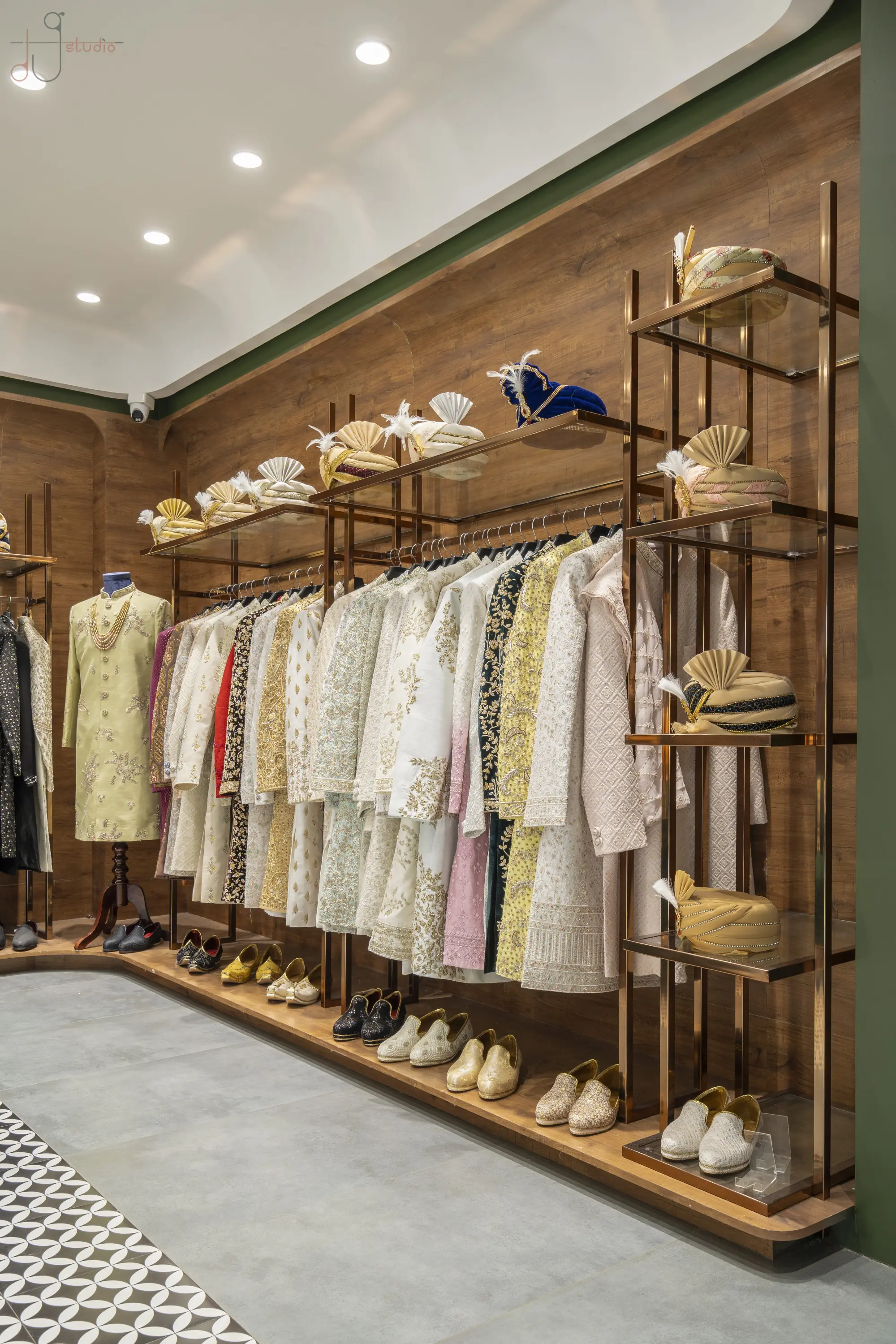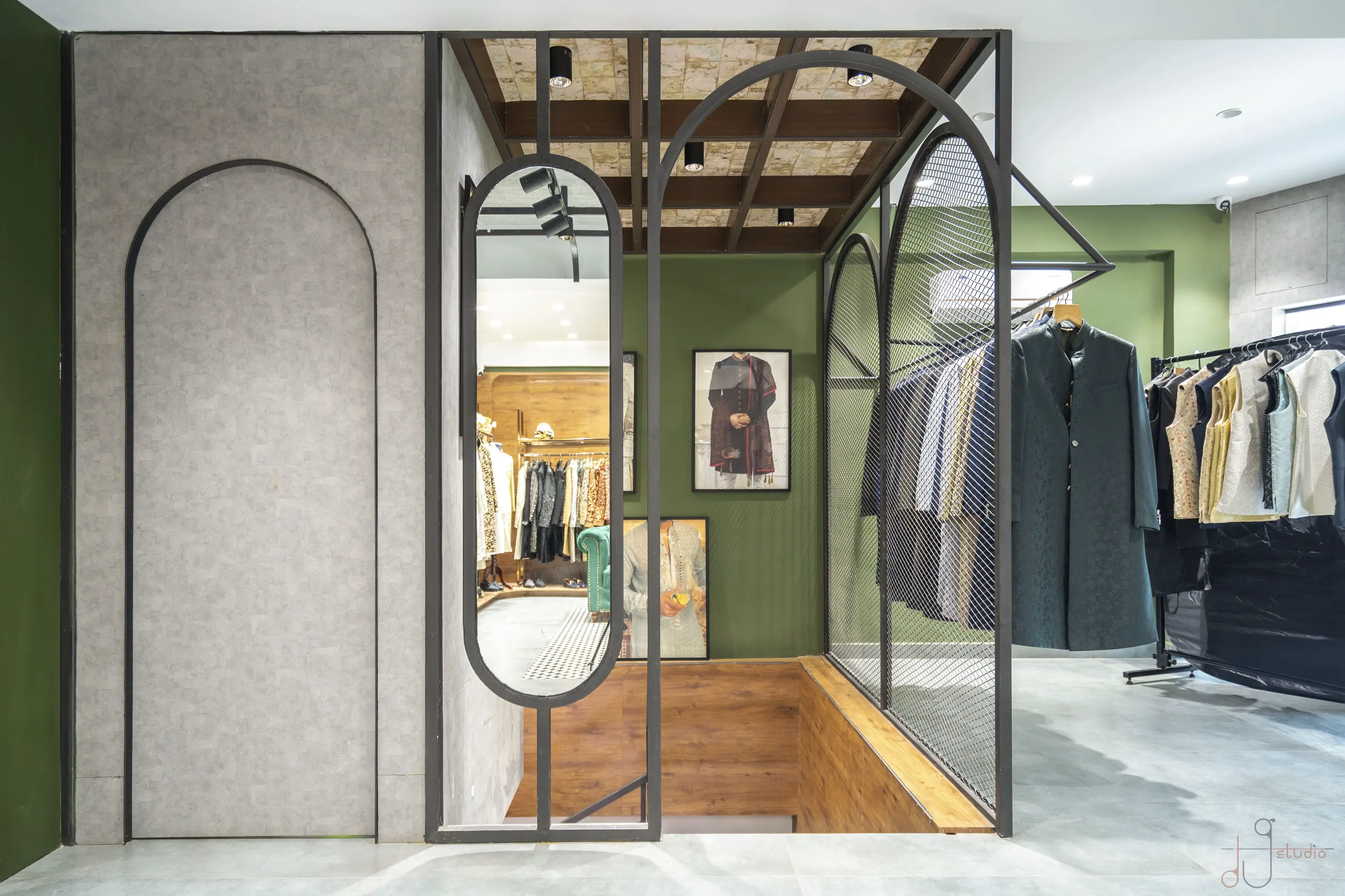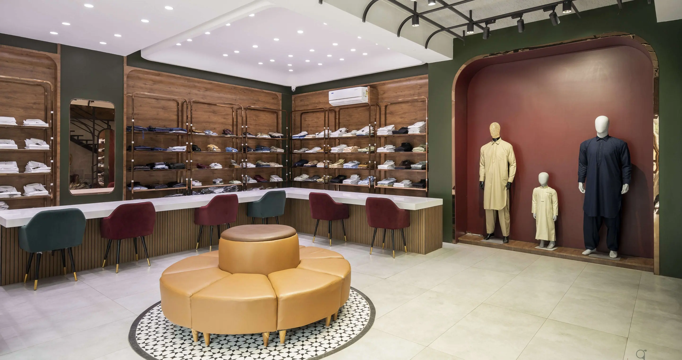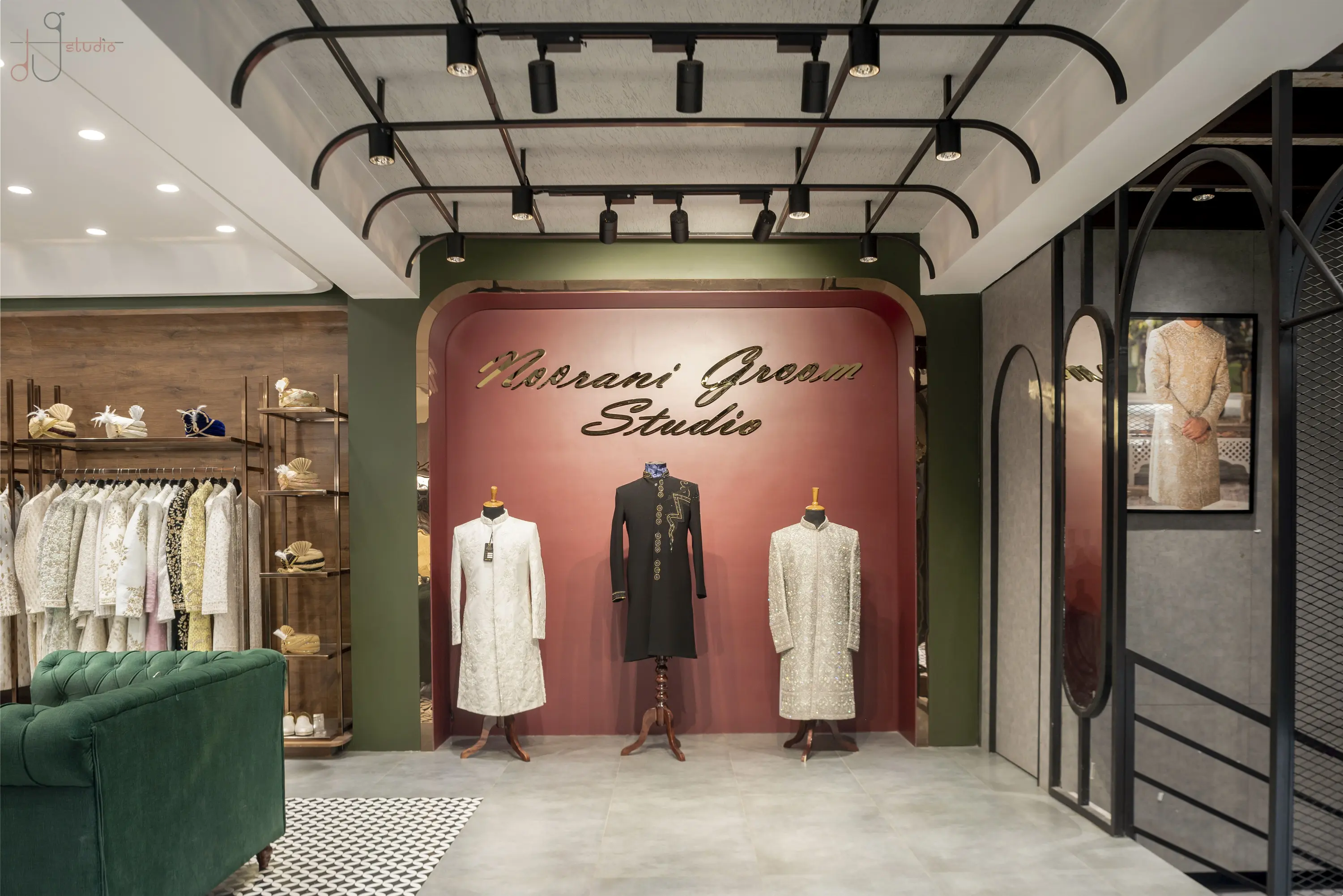 The Noorani Groom Studio is spread across an expansive 6000 sq.ft, meticulously distributed over three levels — each floor catering to a specific category of the groom’s ensemble. The Ground Floor serves as the ready-to-wear Kurta-Pyjama zone. The First Floor showcases an exclusive range of Traditional Sherwanis and Formal Groom Attire. The Second Floor continues the brand legacy by offering dress materials, tying the past to the present. Initially designed as disconnected floor plates, the biggest challenge was to connect the three levels seamlessly. A carefully planned internal staircase was introduced — not just as a circulation solution, but also as a strategic design element. It was positioned in such a way that it integrates naturally into the layout, maintaining the visual balance of each space without disrupting the merchandising flow. Design Brief & Response: The client, already a known name in the dress material business, envisioned scaling up into an exclusive luxury groom studio. The interiors had to reflect this shift — not just visually, but emotionally. It wasn’t just about aesthetics; it was about creating an aspirational retail destination. There was a double responsibility on us — to deliver a space that:There was a double responsibility on us — to deliver a space that: 1.Attracts high-ticket clientele, and 2.Elevates the brand perception into the premium segment. Thus, every design decision — from material palette to lighting, spatial planning to detailing — was approached with deliberate intent. Design Language: A rich yet balanced palette of terracotta red, deep green, wood, and gold invokes both regal sophistication and cultural familiarity. Elements like arched mirrors, metal frames, and vintage lighting celebrate traditional craftsmanship with a modern retail edge. A central display niche with bold signage becomes a storytelling focal point, while the plush emerald green sofa adds comfort and a touch of boutique luxury. Track lighting is used effectively to highlight garment textures and enhance the space’s dimensionality. Conclusion: The final outcome is not just a retail space, but a crafted experience — one that embodies tradition, speaks luxury, and most importantly, resonates with the aspirations of the modern Indian groom.