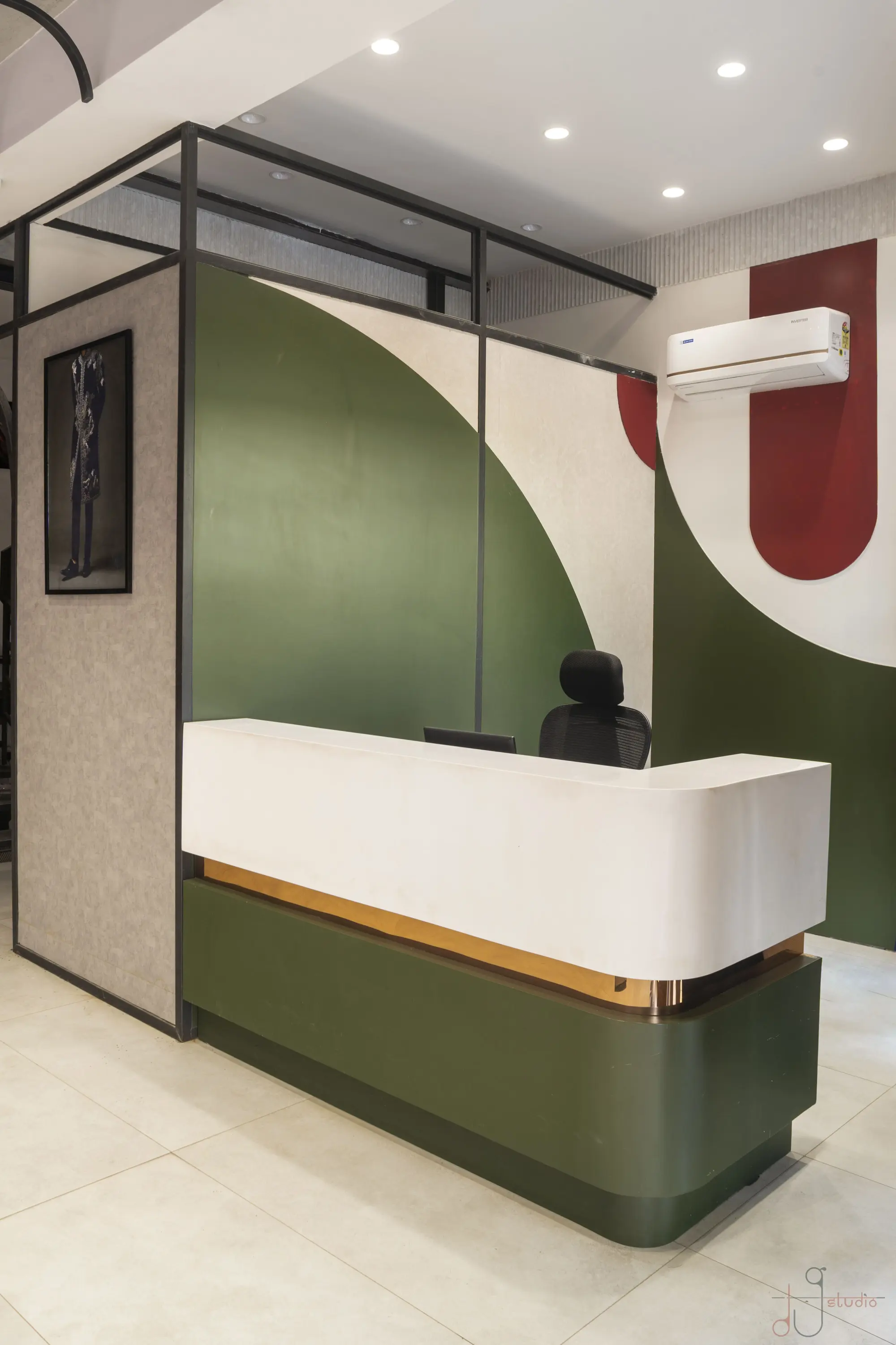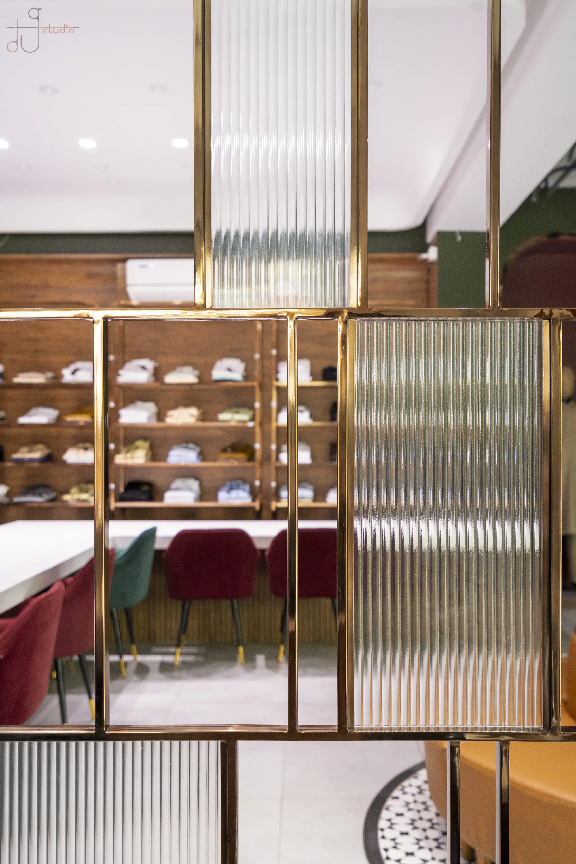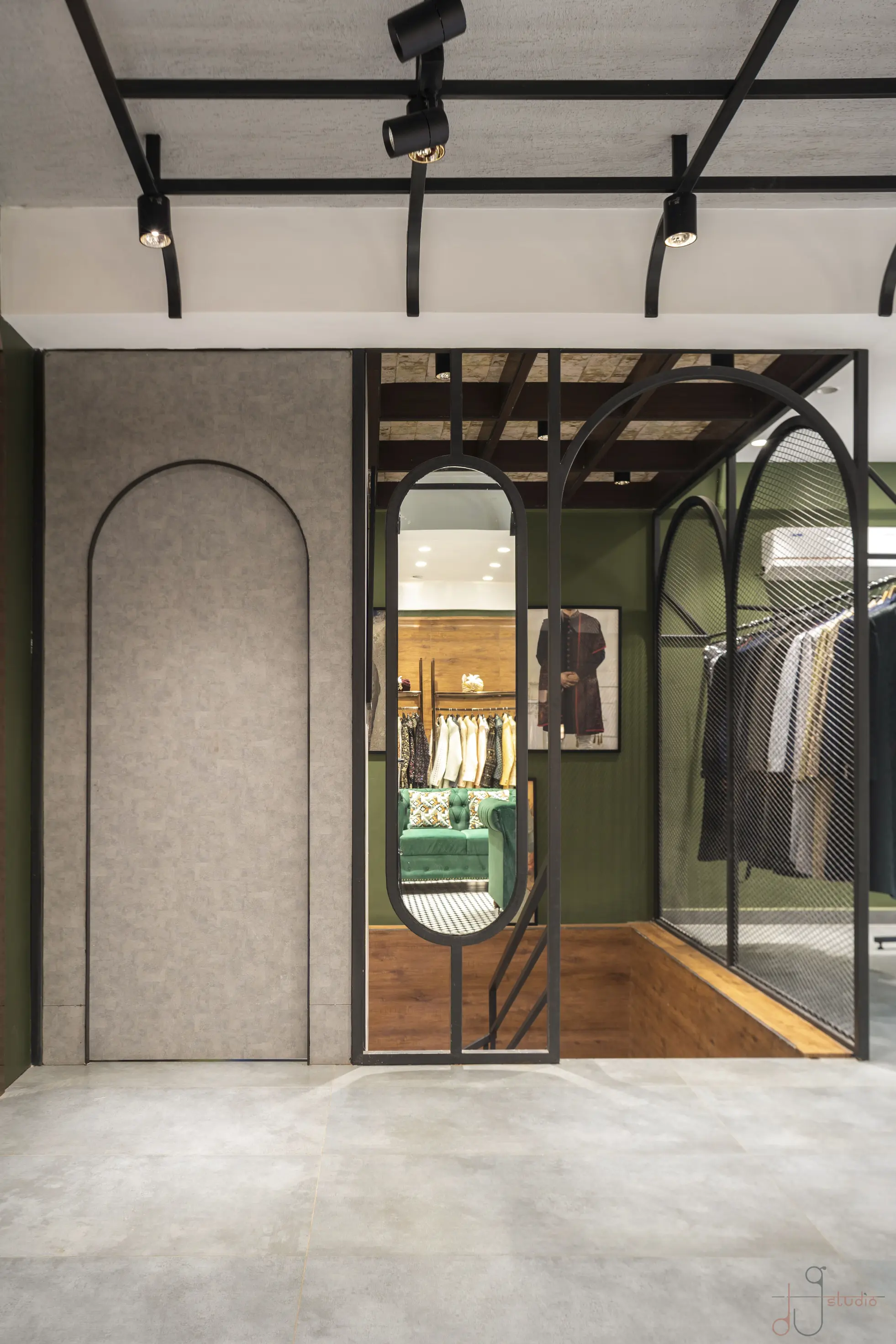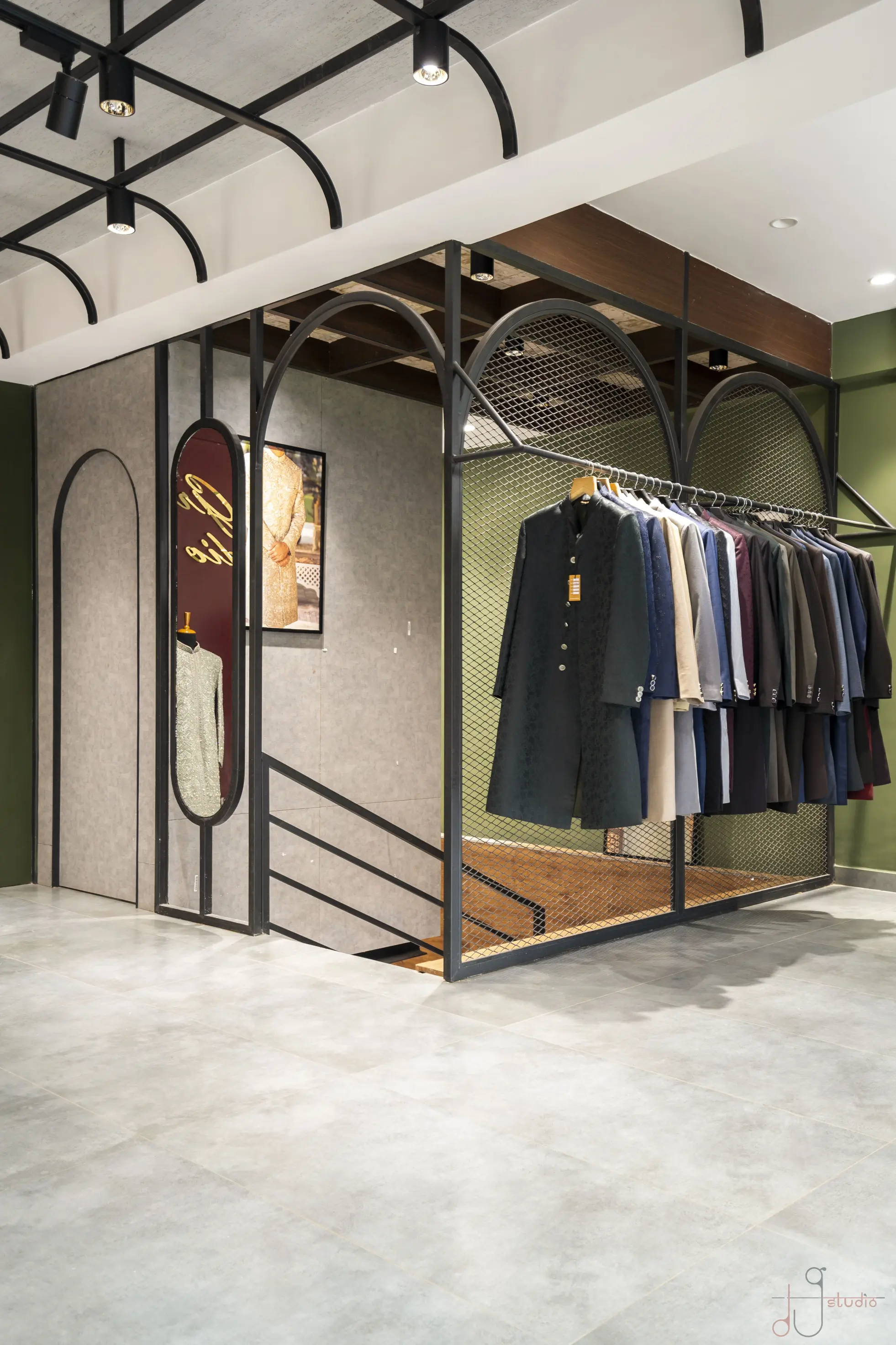 The Noorani Groom Studio is spread across an expansive 6000 sq.ft, meticulously distributed over three levels — each floor catering to a specific category of the groom’s ensemble. The Ground Floor serves as the ready-to-wear Kurta-Pyjama zone. The First Floor showcases an exclusive range of Traditional Sherwanis and Formal Groom Attire. The Second Floor continues the brand legacy by offering dress materials, tying the past to the present. Initially designed as disconnected floor plates, the biggest challenge was to connect the three levels seamlessly. A carefully planned internal staircase was introduced — not just as a circulation solution, but also as a strategic design element. It was positioned in such a way that it integrates naturally into the layout, maintaining the visual balance of each space without disrupting the merchandising flow. Design Brief & Response: The client, already a known name in the dress material business, envisioned scaling up into an exclusive luxury groom studio. The interiors had to reflect this shift — not just visually, but emotionally. It wasn’t just about aesthetics; it was about creating an aspirational retail destination. There was a double responsibility on us — to deliver a space that:There was a double responsibility on us — to deliver a space that: 1.Attracts high-ticket clientele, and 2.Elevates the brand perception into the premium segment. Thus, every design decision — from material palette to lighting, spatial planning to detailing — was approached with deliberate intent. Design Language: A rich yet balanced palette of terracotta red, deep green, wood, and gold invokes both regal sophistication and cultural familiarity. Elements like arched mirrors, metal frames, and vintage lighting celebrate traditional craftsmanship with a modern retail edge. A central display niche with bold signage becomes a storytelling focal point, while the plush emerald green sofa adds comfort and a touch of boutique luxury. Track lighting is used effectively to highlight garment textures and enhance the space’s dimensionality. Conclusion: The final outcome is not just a retail space, but a crafted experience — one that embodies tradition, speaks luxury, and most importantly, resonates with the aspirations of the modern Indian groom.